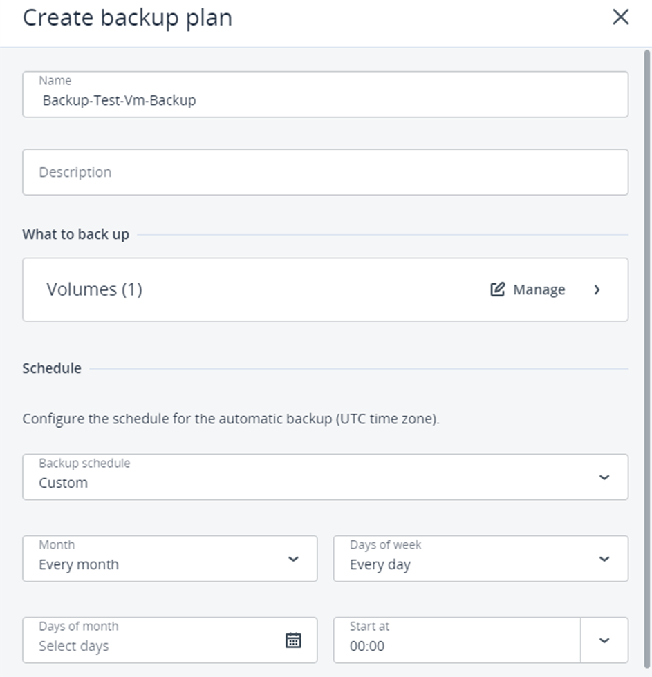 Yukarıda gördüğünüz Create backup plan seçeneğiyle başlıyoruz. Tıkladıktan sonra aşağıdaki ekran açılacak. Bu ekranda yedekleme yapılandırmasını tamamlayacaksınız. Bu işlemler volume bazlı yapılıyor. Yedeklenecek volumeü seçin. Ardından 7 veya 14 günlük varsayılan retention sürelerinden birini seçebilir veya kendi zaman çizelgenizi oluşturabilirsiniz. Kendi zaman çizelgenizi oluşturmak için bu kısımda custom seçeneğini seçtikten sonra yedeklemenin yapılacağı ay veya günleri ve başlayacağı saati kararlaştıracaksınız.